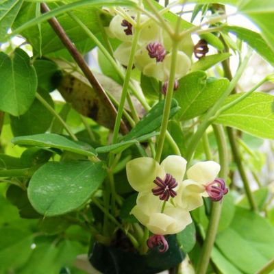Vente en ligne de plants d'Akebia quinata Cream FormCette variété d’Akebia offre une floraison crème rare et délicatement parfumée, alliée à un feuillage semi-persistant et un port grimpant très ornemental pour murs, pergolas ou clôtures. Lire la suite