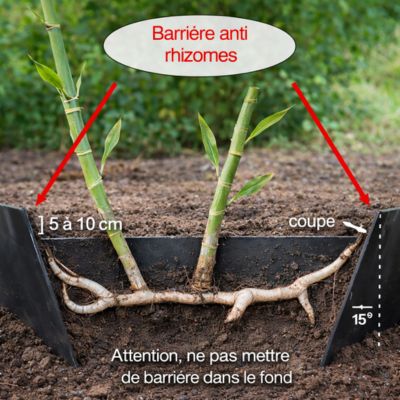 Barrière anti-rhizomes stop racine pour bambouOn installe une barrière anti-rhizomes lorsque l'on plante des bambous à rhizomes traçants pour éviter le développement trop important des bambous. Lire la suite