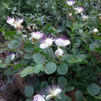 Le Capparis spinosa, appelé communément Câprier, est une plante vivace arbustive et méditerranéenne emblématique. Il se développe en buisson bas, étalé ou retombant, atteignant 30 à 80 cm de hauteur pour 1 à 1,5 m d’envergure. Ses tiges sont souples, parfois munies de petites épines courtes, et portent un feuillage arrondi vert-gris.