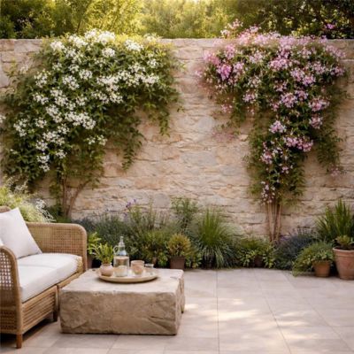Plante grimpante au feuillage vert persisatnt, on profite de sa flraison blanche ou rose de Juin à Septembre.