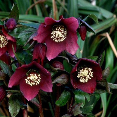L’Hellébore Pretty Ellen Red est une vivace rustique et élégante, très prisée pour sa floraison hivernale abondante. Elle se distingue par ses fleurs simples, larges, d’un magnifique rouge foncé à pourpre profond, parfois légèrement veinées, qui apparaissent de janvier à mars. Portées par des tiges solides, elles s’élèvent au-dessus d’un feuillage persistant, vert foncé, coriace et joliment découpé.