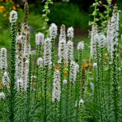 La Liatride Floristan White s'utilise très facilement dans les massifs de vivaces ensoleillés, pour créer de belles verticales blanches contrastant avec des plantes plus basses et aux tons pastel. Elle se marie à merveille avec des Rudbeckias, Lavandes, graminées légères, ou des Sauges arbustives. Son port strictement vertical permet de l'intégrer aussi bien dans un jardin moderne que naturaliste.