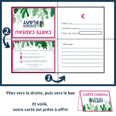 - Utilisable sur l'ensemble du site www.leaderplant.com grâce à un code unique indiqué sur chaque chèque-cadeau (hors frais de port).