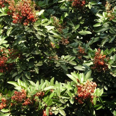 Dans les jardins de style méditerranéen ou sauvage, il s’associe parfaitement avec d’autres essences adaptées aux milieux secs comme les Oliviers, Chênes verts, Cistes ou Lavandes. Le feuillage caduc du pistachier permet aussi de créer des zones ombragées en été tout en laissant passer la lumière en hiver. Enfin, c’est un excellent choix pour la reforestation en zones arides, participant à la lutte contre la désertification et à la préservation de la biodiversité grâce à ses fruits appréciés par la faune locale.
