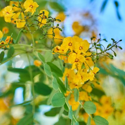 La floraison, spectaculaire, intervient en été : l’arbre se couvre alors de fleurs jaune vif en grappes, très attractives pour les pollinisateurs. Ces fleurs laissent place à des gousses ailées typiques des Fabaceae. Particulièrement adapté aux climats chauds et secs, le Tipuana tipu est rustique jusqu’à -5°C, et préfère une exposition en plein soleil. C’est un excellent choix pour les jardins méditerranéens ou urbains, apportant une touche exotique et de la fraîcheur en été.