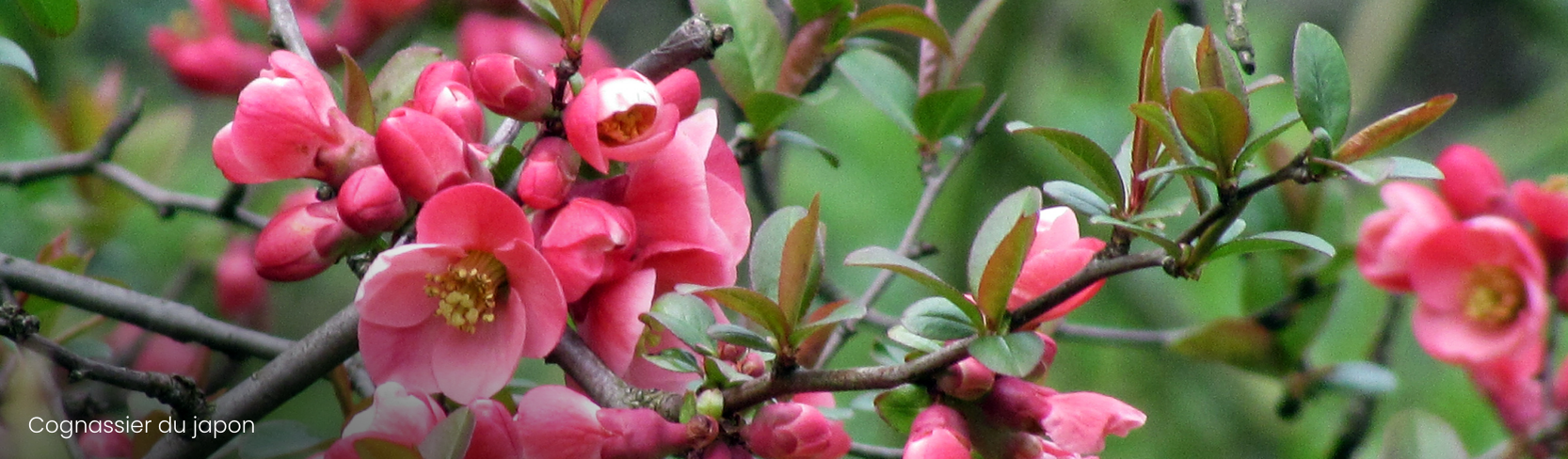 Le cognassier du Japon (Chaenomeles japonica) : C'est l'un des premiers à fleurir, souvent dès février. Ses fleurs, allant du rouge écarlate à l'orange et au rose, apparaissent directement sur le bois nu avant les feuilles. Il est idéal en haie ou en isolé