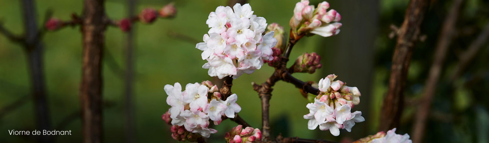 La viorne de Bodnant (Viburnum x bodnantense) : Cet arbuste caduc est un véritable cadeau pour l'hiver. Il produit, sur son bois nu, des grappes de petites fleurs tubulaires au parfum exceptionnel qui passent du rose soutenu à un rose pâle ou blanc une fois épanouies