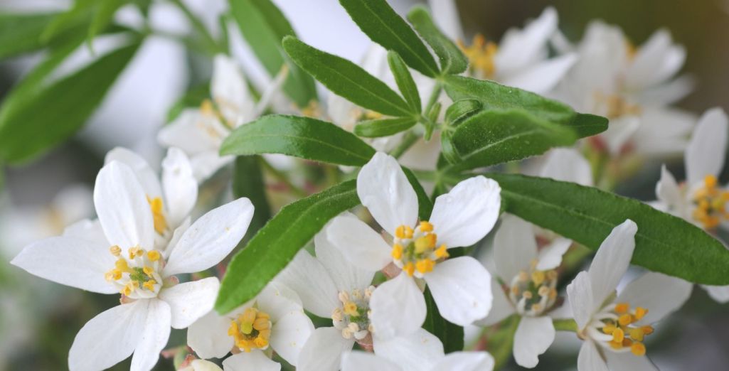 Comportant 5 ou 6 pétales blancs, les fleurs de l'Oranger du Mexique dégagent un parfum d'orange lorsque l'on passe à côté. Elles apparaissent en grappes à l'aisselle des feuilles.