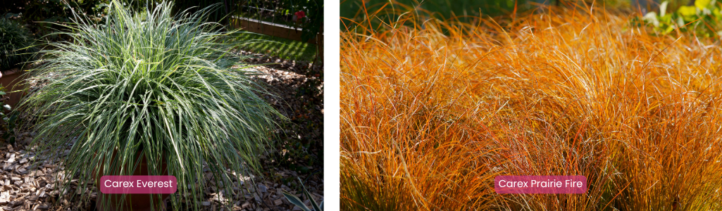 Pour autant certains s'installent dans des sols plus secs. À l'image de Prairie Fire et Carex buchananii, des laîches originaires de Nouvelle-Zélande.