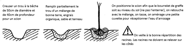 ► On creusera un trou (50x50x40 pour un scion fruitier), on ajoute à la terre extraite de l’engrais organique (sang séché, corne broyée, fumier déshydraté) et on mélange avec un peu de sable grossier (10%) et de terreau (20%)