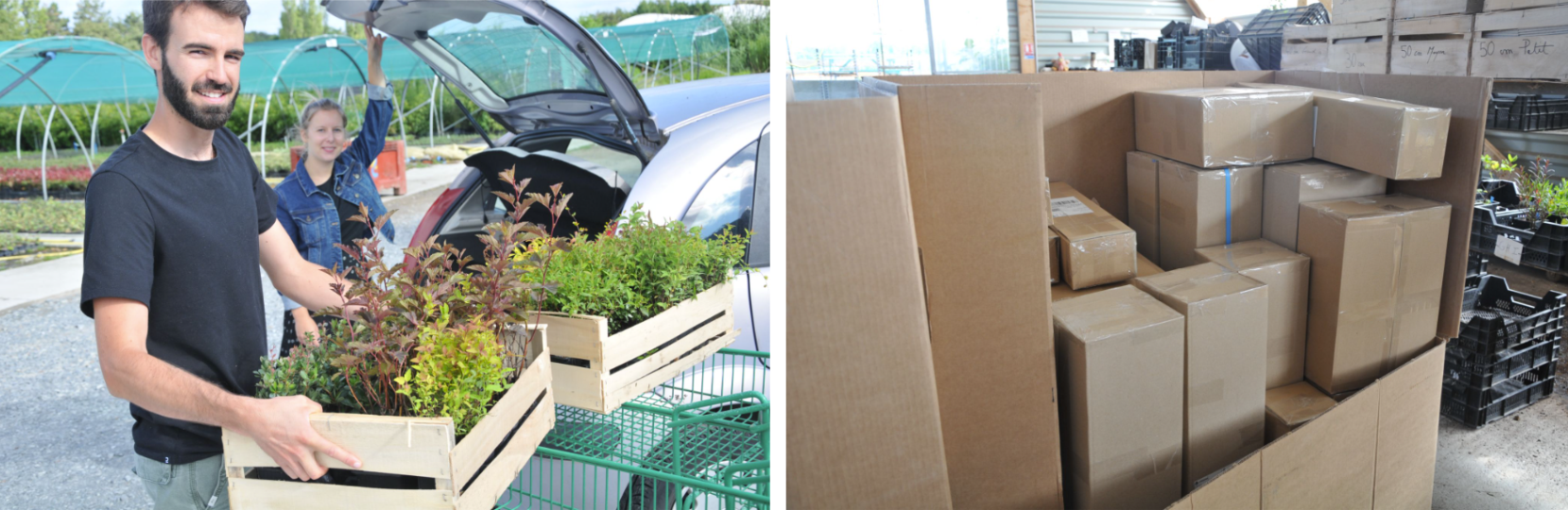 Les commandes volumineuses sont préparées sur palettes, tandis que les formats plus compacts sont conditionnés dans des colis adaptés au transport des végétaux.